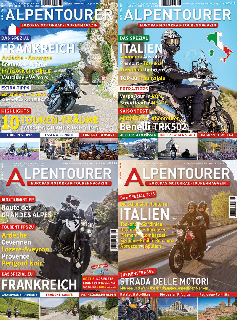 Die derzeit verfügbaren Sonderausgaben von ALPENTOURER aus den Jahren 2021 bis 2024 als KOMBI zum Sparpreis! Über 500 Seiten geballte Informationen zu Touren in halb Europa.