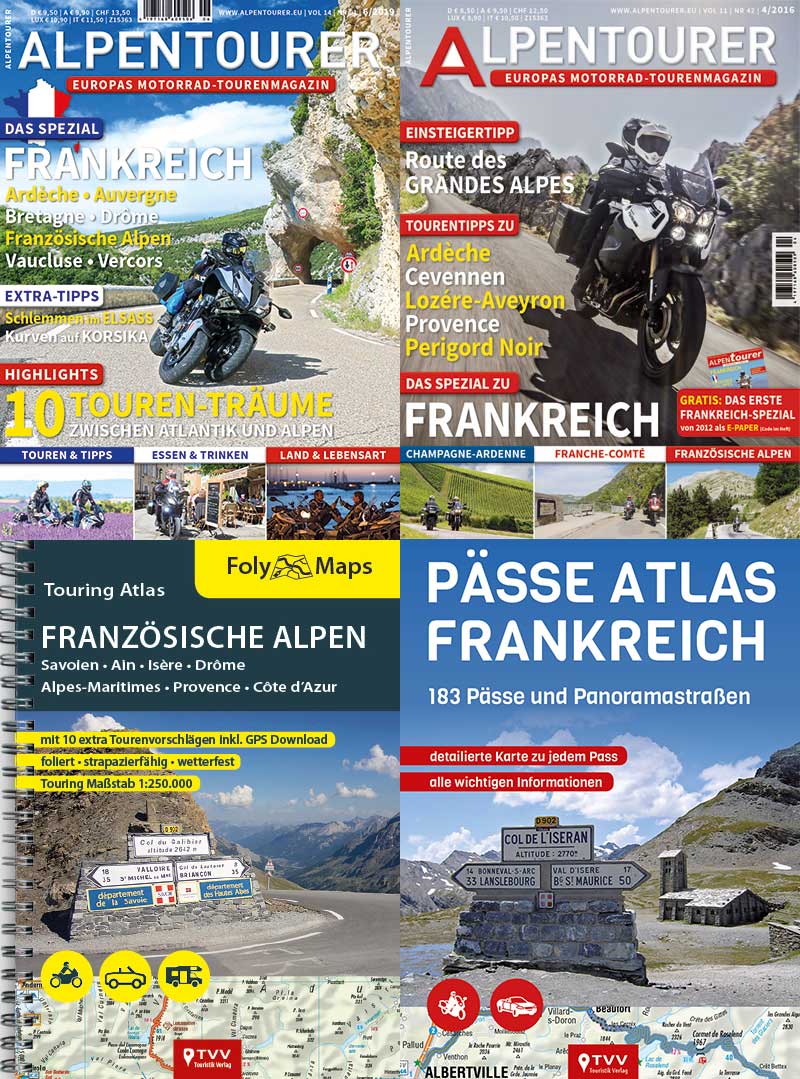 Unsere ALPENTOURER SPEZIAL Sonderausgaben liefern reichlich Anregungen für Touren in den schönsten Zielen Europas. Jetzt haben wir die zwei noch verfügbaren FRANKREICH-Ausgaben zu einem Tourenset gebündelt. Dazu gehört auch noch der Folymaps Touring Atlas Französische Alpen sowie den Pässe Atlas Frankreich. Das Paket für Frankreich-Profis, bestehend aus: