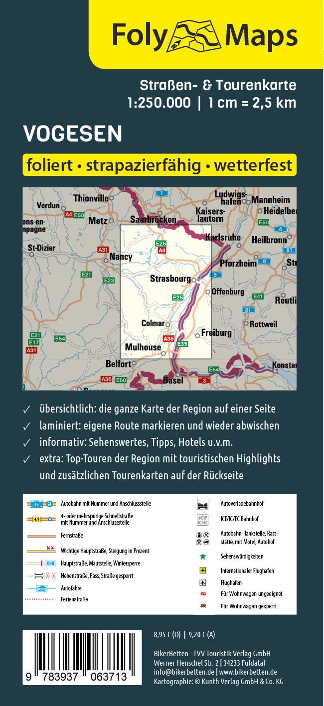 Die FOLYMAPS Straßen- und Tourenkarte zu den französischen Vogesen besticht mit klarer Streckenübersicht im Maßstab 1:250.000. Außerdem sind attraktive Tourvorschläge auf der Rückseite eingezeichnet und beschrieben.
