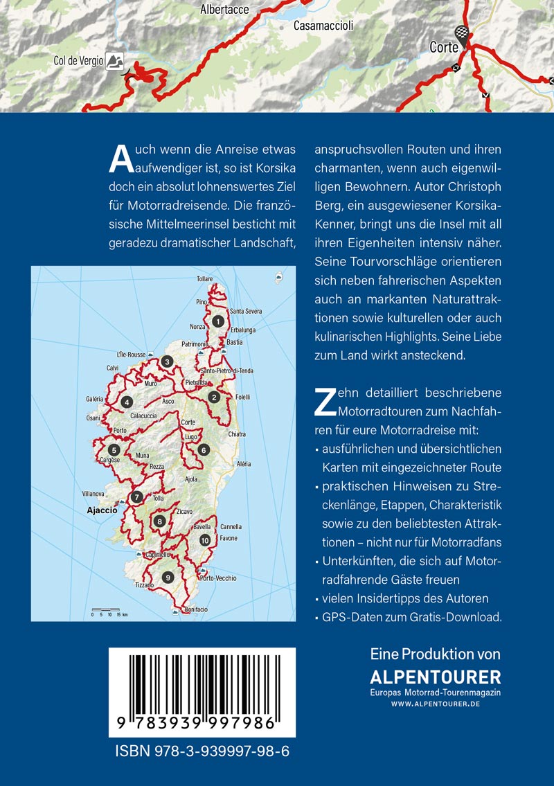 Auch wenn die Anreise etwas aufwendiger ist, so ist Korsika doch ein absolut lohnenswertes Ziel für Motorradreisende. Die französische Mittelmeerinsel besticht mit geradezu dramatischer Landschaft, anspruchsvollen Routen und ihren charmanten, wenn auch eigenwilligen Bewohnern. Autor Christoph Berg, ein ausgewiesener Korsika-Kenner, bringt uns die Insel mit all ihren Eigenheiten intensiv näher. Seine Tourvorschläge orientieren sich neben fahrerischen Aspekten auch an markanten Naturattraktionen sowie kulturellen oder auch kulinarischen Highlights. Seine Liebe zum Land wirkt ansteckend.