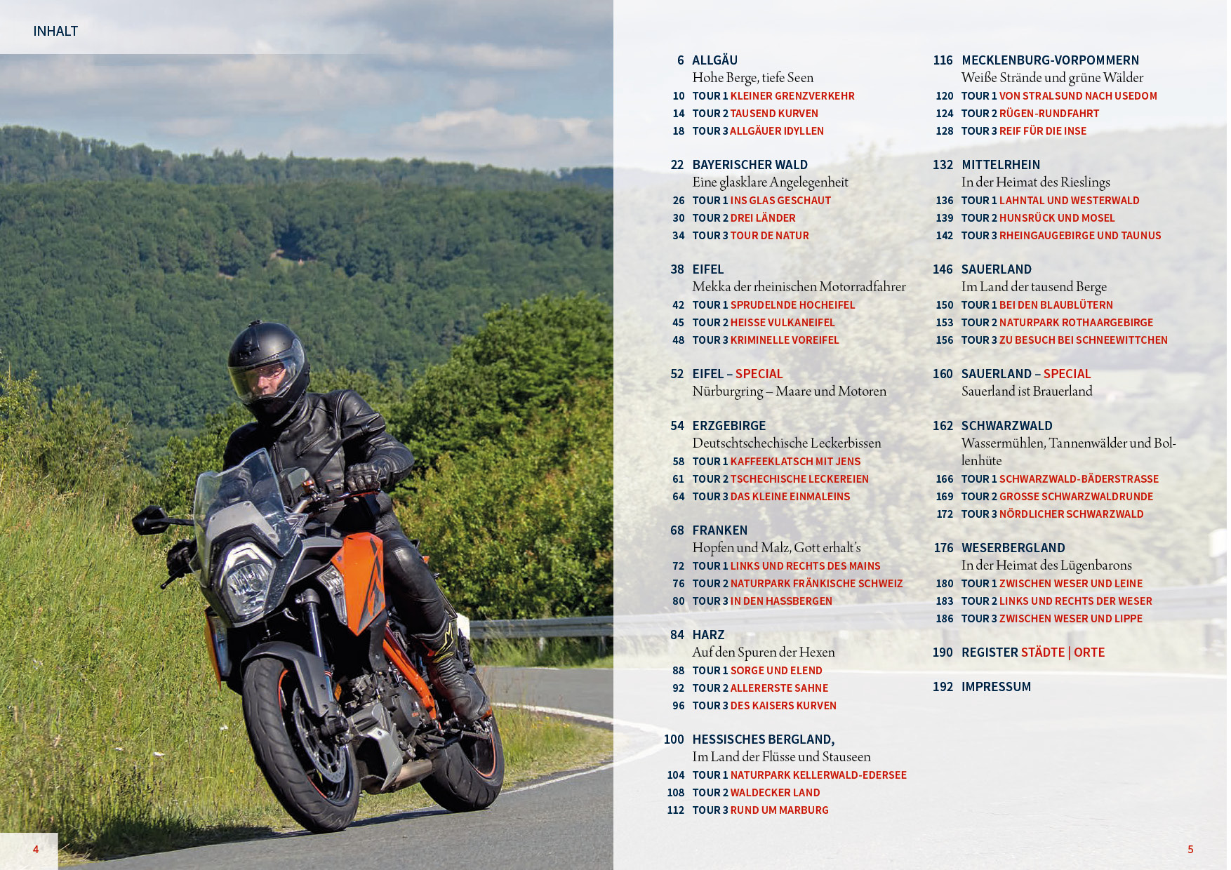 Dieser Motorrad-Reiseführer bietet insgesamt 36 Tourvorschläge in zwölf Regionen Deutschlands zum Nachfahren für den Wochenendausflug oder die längere Reise mit: