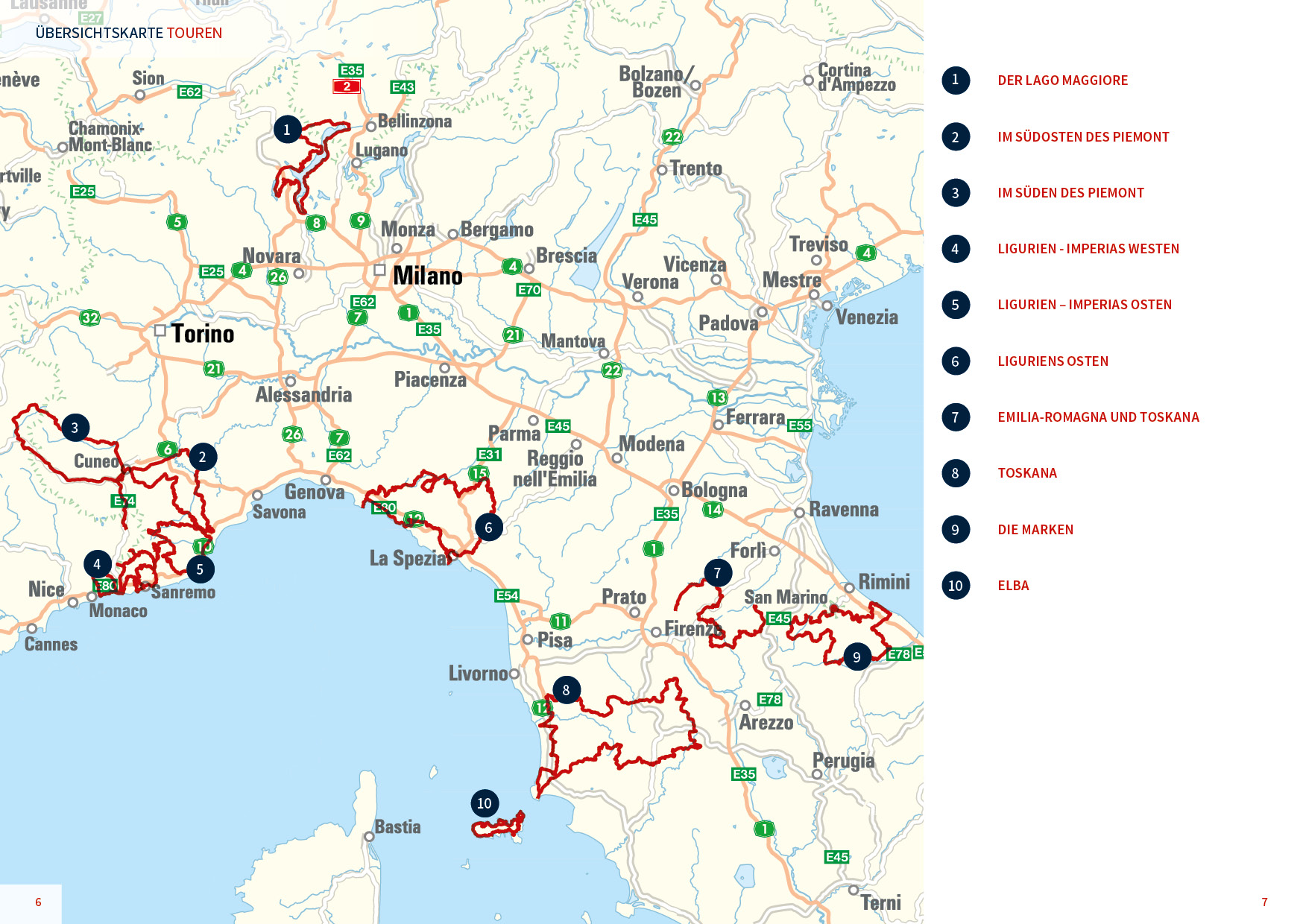Piemont, Ligurien und die Toskana, diese drei im Nordwesten Italiens befindlichen Regionen haben nicht nur eine gemeinsame Geschichte, sondern bieten in Kombination auch ein perfektes Revier für ausgedehnte Motorradtouren. So werden die Landschaften von den Ausläufern der Alpen, des Apennin sowie der Po-Ebene geprägt. Kurvenfeuerwerke sind damit in teils noch stattlichen Höhen garantiert. Aber auch Küstenstraßen mit Blick auf das Ligurische Meer sowie einladende Routen durch Weinberge und unzählige mittelalterliche Städte mit viel Kultur können das Bikerherz begeistern.