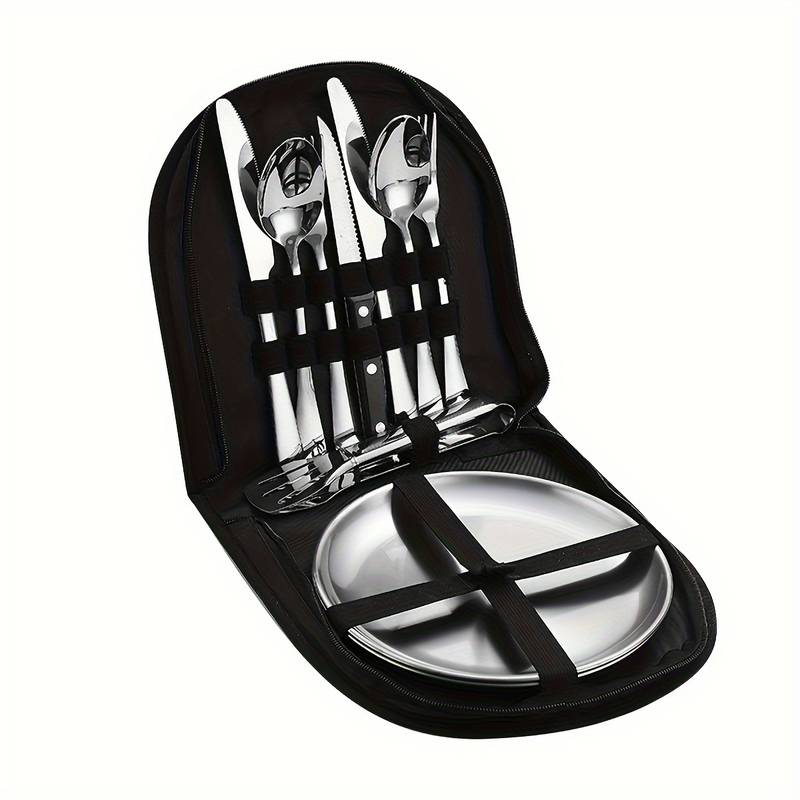 2 Teller sowie jeweils 2 Gabeln, Löffel und Messer werden noch ergänzt durch ein scharfes Universalmesser mit gezackter Klinge sowie einem kurzen Pfannen- und Grillgut-Wender, der auch zum servieren genutzte werden kann. Das praktische Set lässt sich platzsparend zusammenpacken und in der mitgelieferten Nylontasche transportieren.