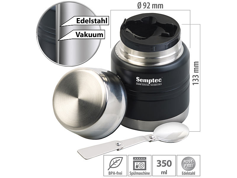 - Vakuum-Thermobecher inklusive faltbarem Löffel und deutscher Anleitung