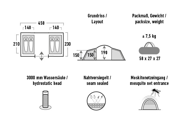 Ihr seid als Gruppe unterwegs, möchtet aber nicht mehr als ein Zelt mitführen? Das Teamzelt Como bietet 2-4 Personen ausreichend Platz in seinen zwei gegenüberliegenden Schlafbereichen: Auf 210 Zentimetern Länge und 140 Zentimetern Breite liegt es sich hier sehr komfortabel, mit 150 Zentimeter Raumhöhe ergibt sich auch insgesamt ein angenehmes Raumgefühl.
