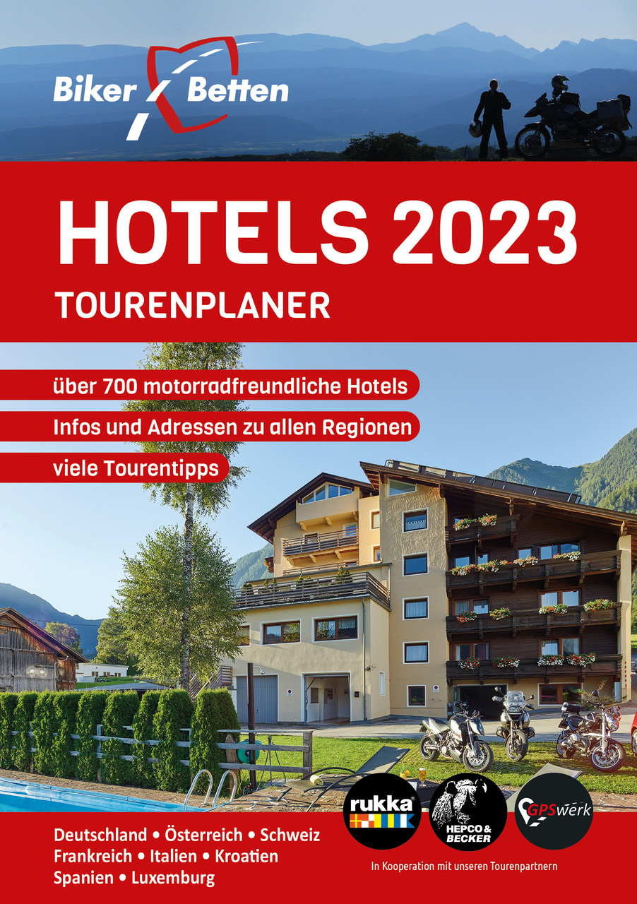 Der BIKERBETTEN Katalog vereint alle Länder, aus denen Hotels gelistet sind, in einem gemeinsamen Druckwerk. Er wird jährlich komplett überarbeitet und erscheint in einem übersichtlichen Layout. Hunderte motorradfreundlicher Übernachtungsempfehlungen sind auf den prall gefüllten Seiten enthalten. Sie erstrecken sich auf Deutschland und weitere Länder in Europa: Österreich, die Schweiz, Frankreich, Italien, Spanien, Kroatien und Luxemburg.