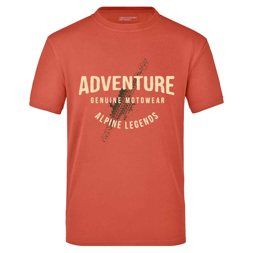 Das perfekte T-Shirt für reiselustige Abenteurer besteht aus einer hochwertigen Mischung von doppelflächigem Struktur-Jersey mit atmungsaktivem Polyester-CoolDry®. Die hochwertige Polyester 5-Kanal-Faser, die auf der Innenseite verarbeitet wurde, leitet die Körperfeuchtigkeit schnell nach außen, wo sie auf der geschmeidigen Baumwoll-Außenseite optimal verdunsten und abtrocknen kann. Doppelt gearbeitete Nähte an Schultern, Hals-und Armausschnitt und ein weiches Necktape sorgen für einen langlebigen und komfortablen Einsatz des ADVENTURE T-Shirts. Der großflächige Sublistop-Print auf der Brust sieht nicht nur gut aus, er ist auch ein Statement: ADVENTURE – ALPINE LEGENDS GENUINE MOTOWEAR!