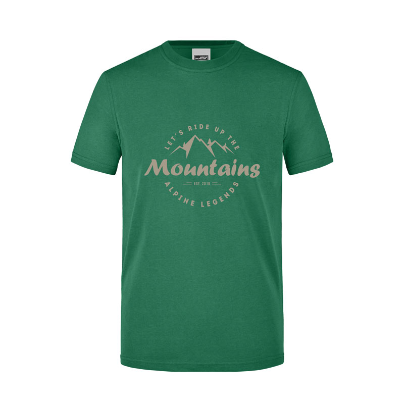 Das perfekte T-Shirt für deine perfekte Bergtour! Eine hochwertige Mischung aus hautfreundlicher Baumwolle und robustem Polyester bietet überzeugenden Tragekomfort und vereint diesen mit der Funktionalität von Kunstfasern, weil es den Feuchtigkeitstransport von der Haut unterstützt und deutlich schneller trocknet als reine Baumwoll-Shirts. Der Halsausschnitt ist dank Elasthan und Necktape hochwertig und formstabil. Der großflächige Sublistop-Print auf der Brust sieht nicht nur gut aus, er ist auch ein Statement: LET'S RIDE UP THE MOUNTAINS!