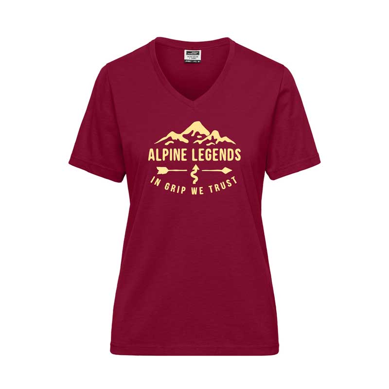 T-Shirts für reiselustige Motorrad-Frauen müssen einiges aushalten. Eine hochwertige Mischung aus gekämmter, ringgesponnener BIO-Baumwolle und robustem Polyester hat sich hierfür bewährt. So bietet dieses Shirt einen besonders hautfreundlichen Tragekomfort und vereint diesen mit der Funktionalität von Kunstfasern, weil es den Feuchtigkeitstransport von der Haut unterstützt und deutlich schneller trocknet als reine Baumwoll-Shirts. Der V-Halsausschnitt ist dank Elasthan und Necktape hochwertig und formstabil. Der großflächige Sublistop-Print auf der Brust sieht nicht nur gut aus, er ist auch ein Statement: ALPINE LEGENDS: IN GRIP WE TRUST!