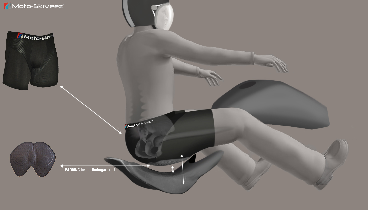 Moto-Skiveez® wurden speziell für Motorradfahrer entwickelt, weil herkömmliche Polster, etwa Gelkissen aus Fahrradhosen etc., den speziellen Sitzpositionen auf einem Motorradsattel nicht anzupassen sind. Bei der Entwicklung wurden zunächst Wärmebilder erstellt, die genau die Druckpunkte an Steiß, Po und Schenkeln auf verschiedenen Motorradtypen darstellen. Daraus sind dann die Vorgaben für die unterschiedlichen Skiveez-Modelle wie eben Cruiser, Adventure oder Sport entstanden.