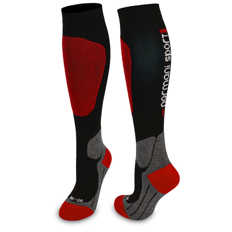 Funktionelle Materialzusammensetzung: 50 % Polyamid, 25 % Polyester, 25 % Elasthan. Mittlere Kompressionswirkung. Mit Links/Rechts- sowie Größen-Kennzeichnung und ausgeprägtem Fußbett. Farbe: Rot-Schwarz.