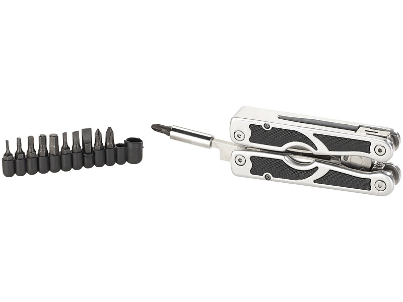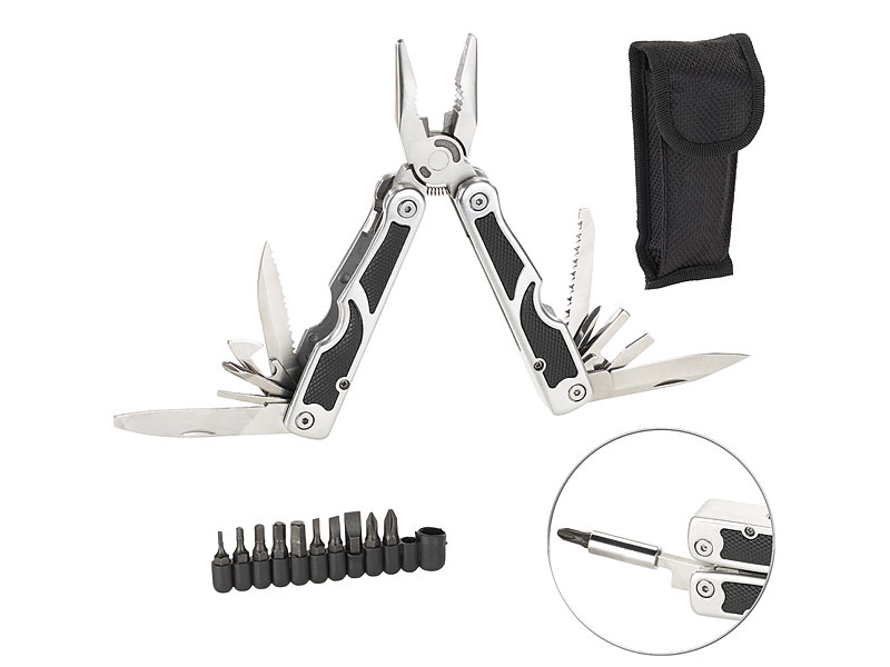 - 27 integrierte Werkzeuge mit Zange, Spitzzange, Drahtschneider, kleinem und großem Messer, gezahntem Messer, Säge, doppelseitiger Feile, Dosen- und Flaschenöffner, 3 integrierten Schraubendrehern, 11 Schraubendreher-Bits und Bit-Adapter, Bit-Adapter-Halterung