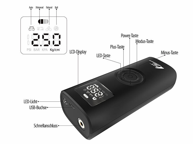 Der korrekte Druck bei Auto- oder Motorradreifen spart nicht nur Kraftstoff, er ist auch wichtig für sicheres Fahrverhalten. Mit diesem ultrakompakten Akku-Kompressor lässt sich der Reifendruck bequem zu Hause wie auch unterwegs kontrollieren - etwa im Urlaub, vor einer Motorrad-Tour oder beim Räderwechsel. Einfach den gewünschten Druck einstellen - den Rest erledigt die Pumpe! Bei Erreichen des gewünschten Luftdrucks beendet sie den Aufpump-Vorgang automatisch.