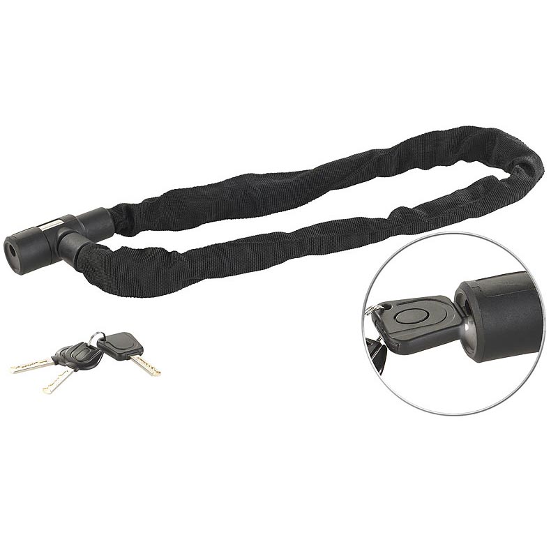 Safety first! Wer unterwegs auf Nummer sicher gehen möchte, führt ein solides Kettenschloss mit sich. Dieses hier ist 80 cm lang, und seine Glieder sind aus sechs Millimeter starkem, spezialgehärtetem Stahl. Auch dem massiven Schlosskörper ist mit roher Gewalt nicht einfach beizukommen. Daran beißen sich die bösen Jungs die Zähne aus …